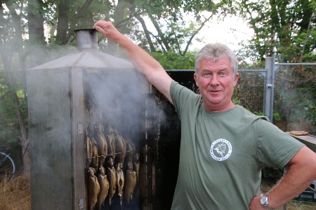 Unser neues Vereins - T - Shirt ist wirklich schick. Bernd trägt es gern in seiner Freizeit und nicht nur beim Angeln...